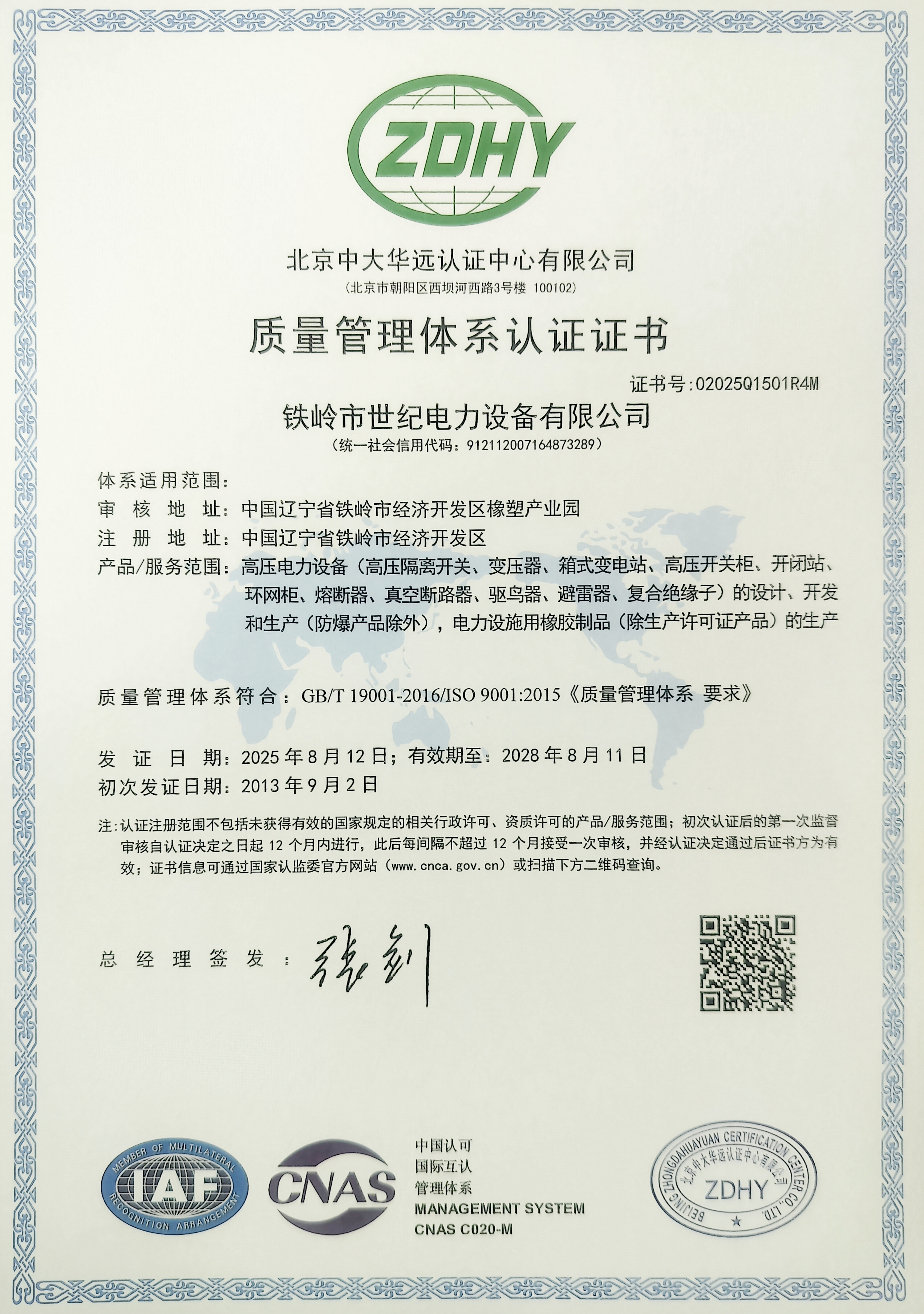 鐵嶺市世紀(jì)電力設(shè)備有限公司是集科研開發(fā)、生產(chǎn)制造、用戶服務(wù)于一體的國家高新技術(shù)企業(yè),始建于1999年,位于鐵嶺經(jīng)濟(jì)開發(fā)區(qū),占地面積5萬余平方米,建筑面積2萬余平方米。主要從事國家電網(wǎng)配套戶外高低壓隔離開關(guān)、電力電纜、變壓器成套裝置、高低壓開關(guān)柜、箱式變電站、絕緣子等產(chǎn)品的研發(fā)、生產(chǎn)和銷售。公司現(xiàn)有國家發(fā)明專利6項、實用新型專利9項,公司通過了ISO9001國際質(zhì)量管理體系認(rèn)證、ISO14001環(huán)境管理體系認(rèn)證和ISO 45001職業(yè)健康安全體系認(rèn)證。